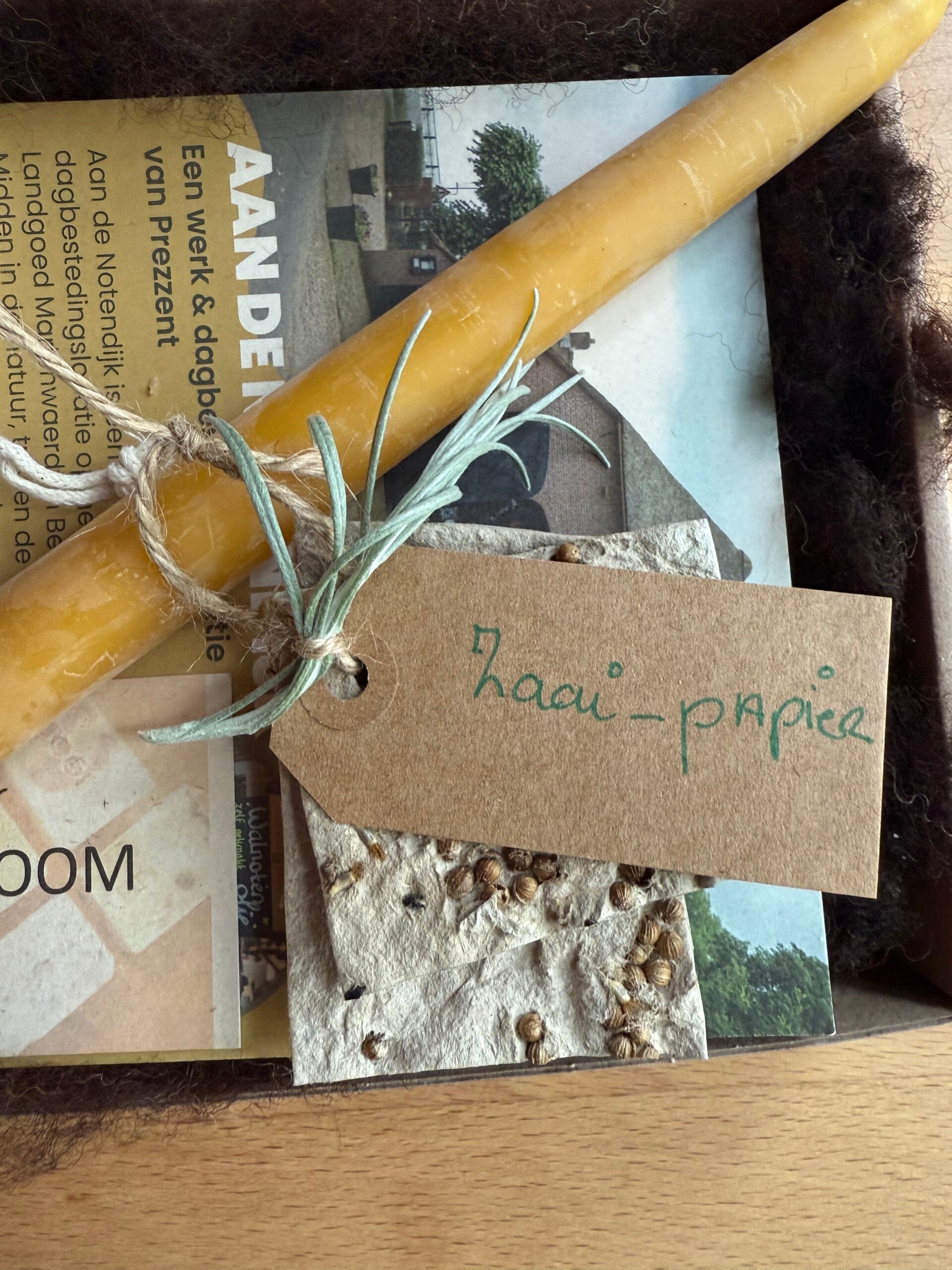 Samen met de zorg een mooi samengesteld cadeautje. Ambachtelijke zeep, kaars en een boekje met zaaipapier. De zeep keuze mag je zelf bepalen.